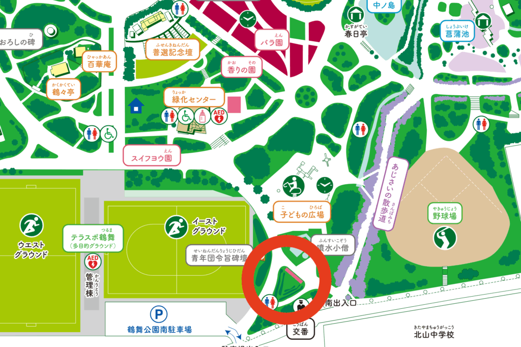 園芸福祉花壇の場所は、子ども広場から南出入口への道沿いです。