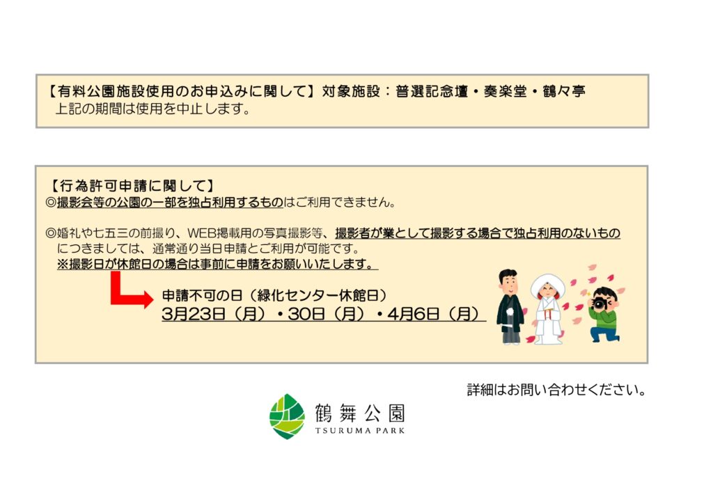 いつも鶴舞公園をご利用いただき、誠にありがとうございます。2026年3月~4月の桜開花期間における有料公園施設の利用ならびに、行為許可申請につきまして安全面を考慮し、以下の日程の使用を制限させていただきます。