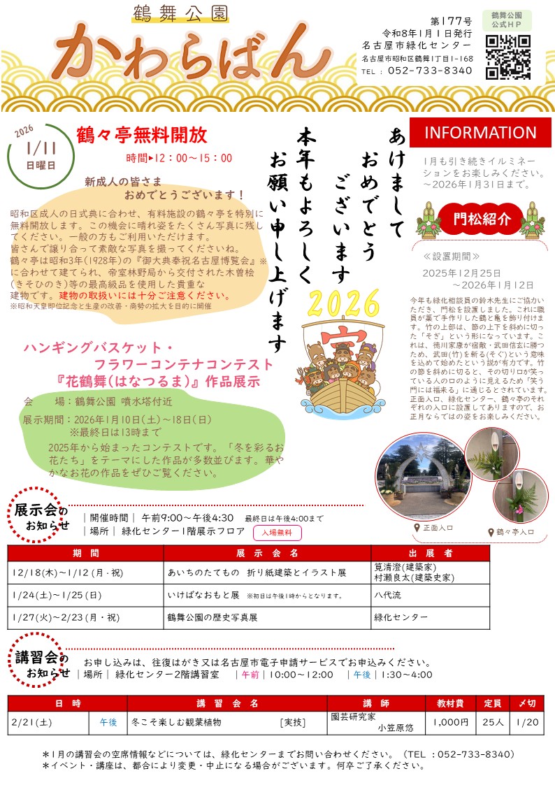 かわらばん1月号を発行しました。緑化センターでは紙のかわらばんを配布しています。年末が近づくと街中でも見かけることが増える門松鶴舞公園でも園内3か所に個性さまざまな門松を設置しています。ぜひその違いもお楽しみください。