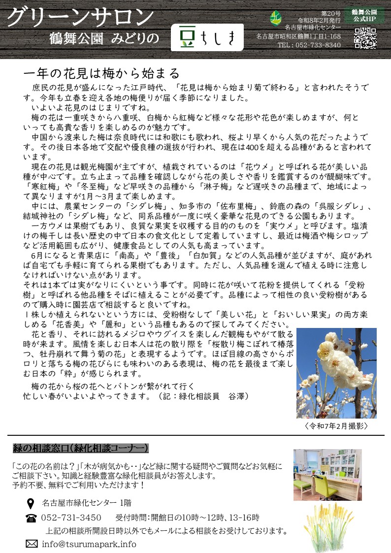 今月のグリーンサロンを発行しました。今回は梅から始まる一年のお花見のお話です。鶴舞公園でも毎年最初に咲くウメから、開花が始まりました!ウメの木の下に入るととっても良い香りが楽しめます。梅からバトンが回っていく、春のお花見を楽しみましょう♪