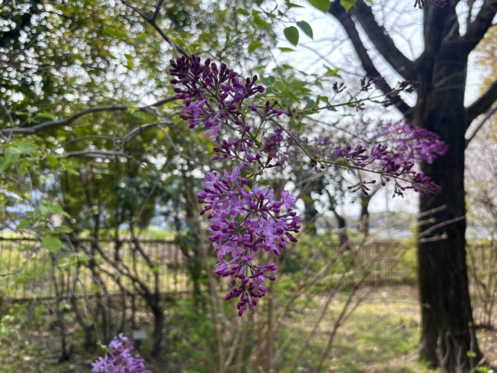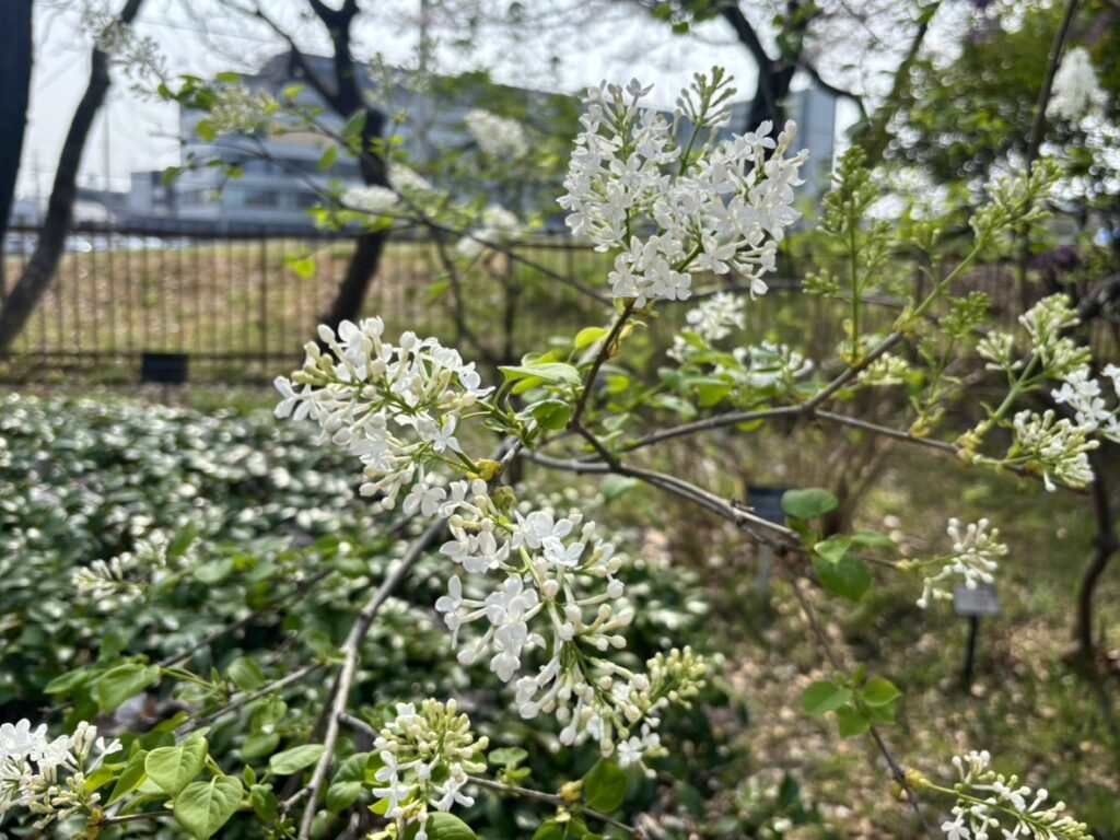テラスポ鶴舞と子ども広場の間の道沿いでライラックが開花しています。