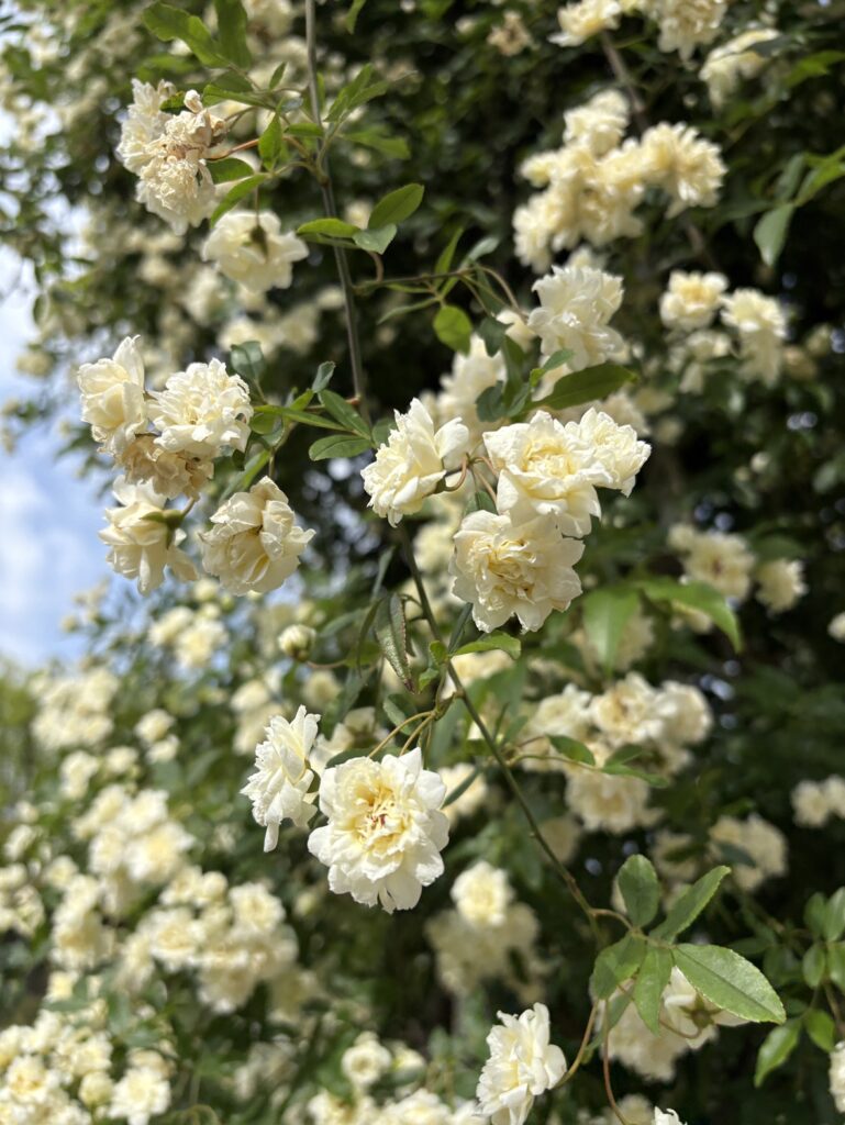 先に咲き出すのは黄花の「キモッコウバラ」。続いて白花の「モッコウバラ」が咲いてきます。